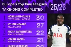 谁最能过人?五大联赛过人榜:库杜斯30次第1!姆巴佩2亚马尔4